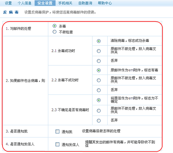 如果您购买了并安装 Sophos 杀毒引擎,则系统不仅可以帮您扫描病毒邮件,还可从病毒邮件中清除病毒,对您的邮件不产生任何危害的过程。