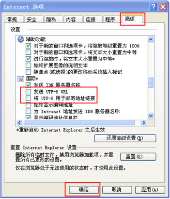 2) 在 Internet 选项里面的“高级”标签,找到“浏览”选项,然后取消掉“总是以 UTF-8 发送 URL”,最后点击“确定”按钮,保存您做过的更改。