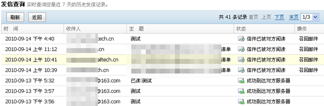 您可以单击 Webmail 界面左上角的用户自助查询”发信查询”查看。如果收件人不是本站内用户,则您只能查看邮件是否投递到对方邮箱;如果收件人是本站内的用户,则您还可查看到邮件是否被对方阅读。